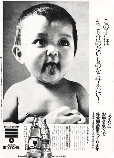 In 1968, Mizkan came up with an audacious plan for a natural food campaign. It was a big awareness drive that included newspaper advertisements and catchphrases such as "Only Mizkan vinegar is 100% brewed" and “Only additive-free food for my child!”. The campaign strongly emphasized the reliable quality of Mizkan vinegar and the peace of mind it gave to consumers. While it attracted a great deal of interest from the public, it also drew a strong backlash from within the industry. However, with the backing of the growing consumer movement at the time, Mizkan's claims began to gain widespread support. In 1970, the government announced the labeling categories of "brewed vinegar" and "synthetic vinegar." Finally, in 1979, with the establishment of the Japanese Agriculture Standard (JAS), it became mandatory to label vinegar as brewed or synthetic. Mizkan's natural food campaign changed public opinion and even regulations. The driving force behind this was none other than the consumers who endorsed Mizkan's stance.