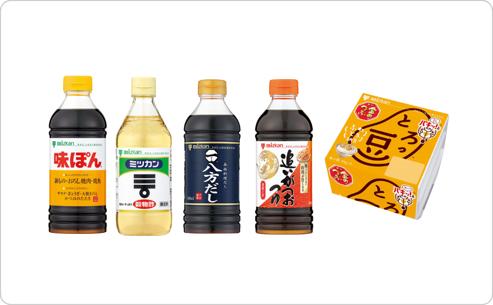 An introduction to our business in Japan + Asia, which focuses on foods such as vinegar, ponzu, hot-pot tsuyu, and natto, as well as food-service ingredients and ready-made meals.
