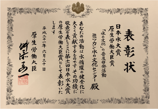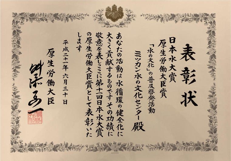 Received 11th Japan Water Grand Prize Minister of Health, Labor and Welfare Award