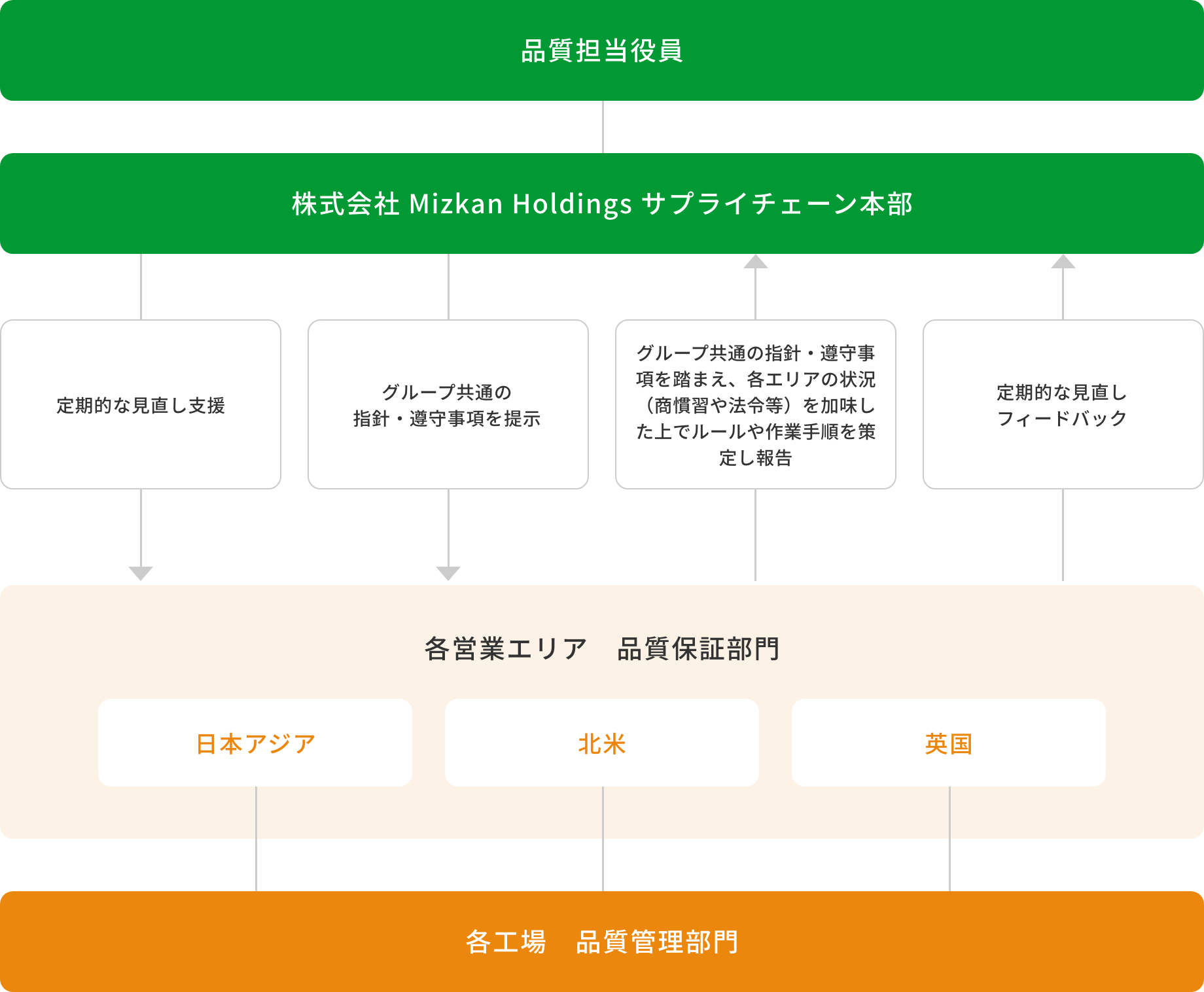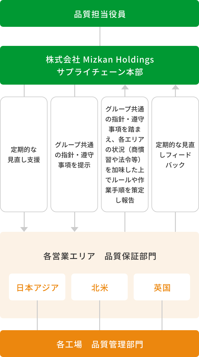 ミツカングループでは、品質を管掌する役員のもと、品質全体を統括する株式会社Mizkan Holdingsの品質環境本部、各事業エリア(日本・アジア、北米、英国)の品質保証部門、工場の品質管理部門が連携する体制を取っており、守るべきルールを定め、遵守し、それらを定期的に見直すことで品質保証の堅牢性を担保しています。また、グループで定めた品質KPIを定期的にモニタリングし、四半期および年度末の経営へのマネジメントレビューを通して、グループ全体の状況把握や情報共有、リスク抽出や問題解決のための議論などを行なっています。こうした複数の取り組みを通して、グループ全体で食の安全を担保し、お客様の安心を保証しています。