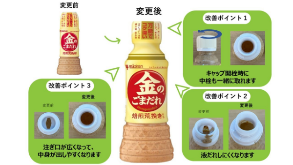ミツカンは金のごまだれシリーズのキャップのデザインを一新し、使いやすさと環境保護の両立を図っています。