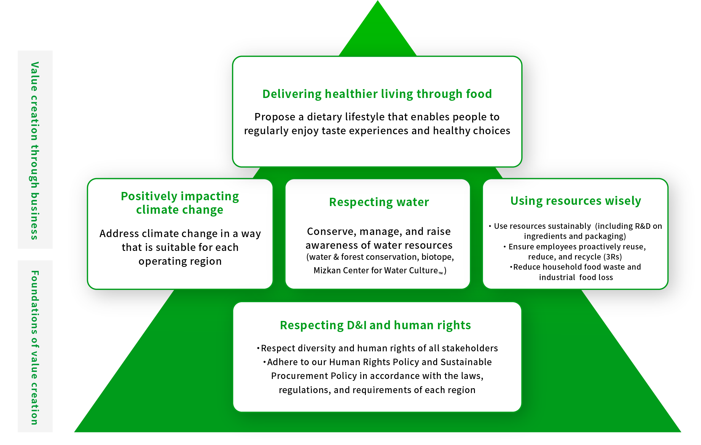 ミツカンは、環境、社会、食生活への貢献を実現するために、未来ビジョン宣言を策定し、人と社会と地球の健康を重視して事業活動を通じた人権尊重、環境配慮に取り組んで参りました。